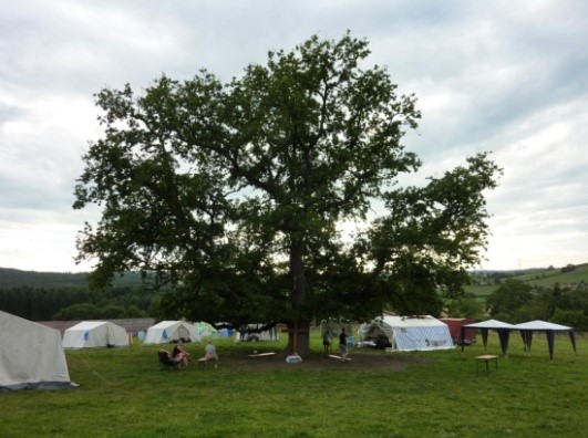 Unser Zeltlagerplatz ist dabei nicht direkt in Taizé, sondern etwa 10 Kilometer entfernt auf einer Obstwiese im kleinen Ort La Vineuse. Von hier aus starten dann einmal täglich unsere Fahrten zu einem Mittags- oder Abendgebet der Brüder nach Taizé.